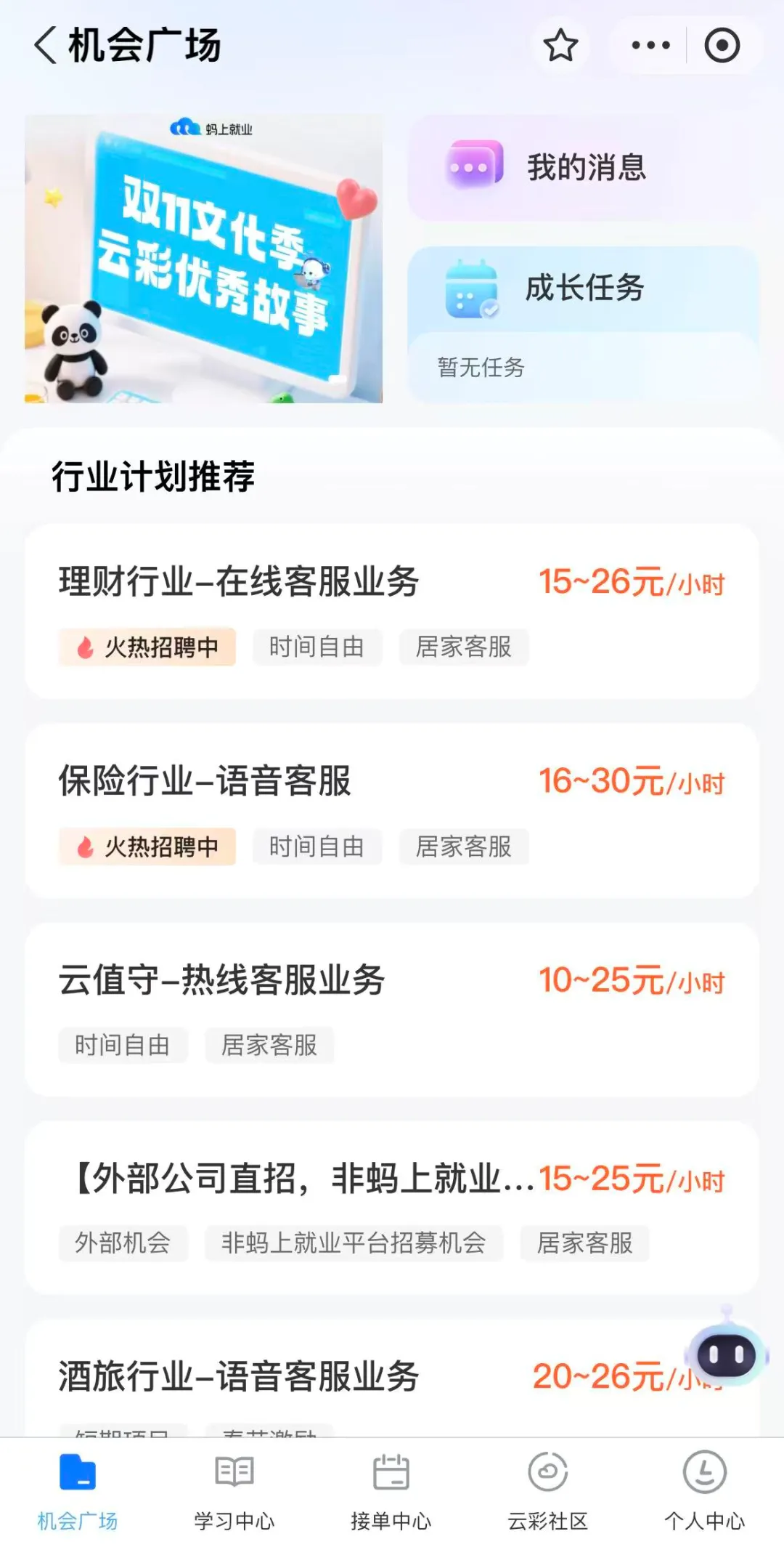 目前在招理财行业-在线客服、保险行业-语音客服、物流行业-语音客服业务、支付宝安全-语音客服业务等,岗位要求及薪资如下图所示;更多岗位会陆续上新,以报名页面的显示为准