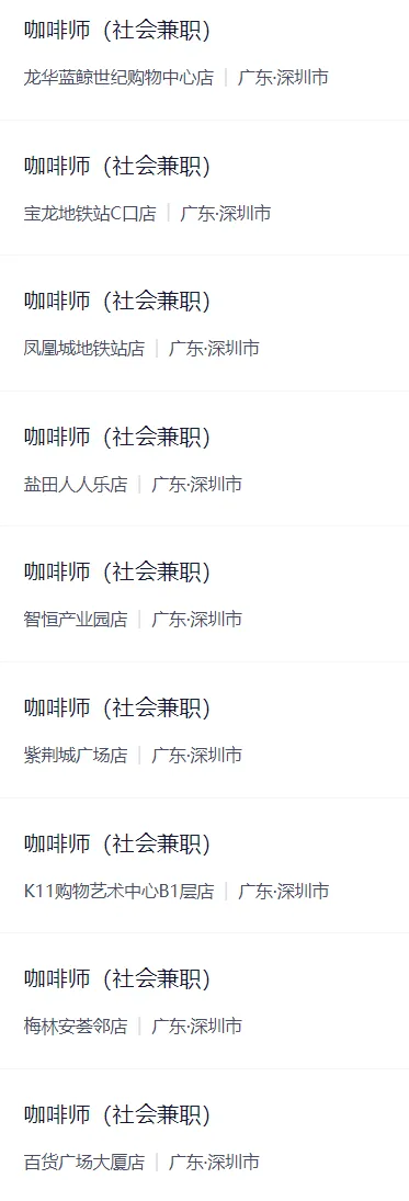 咖啡师(学生兼职、社会兼职都有)。深圳多个门店都有招聘,部门门店展示如下,全部招聘门店,可进入招聘页面查看