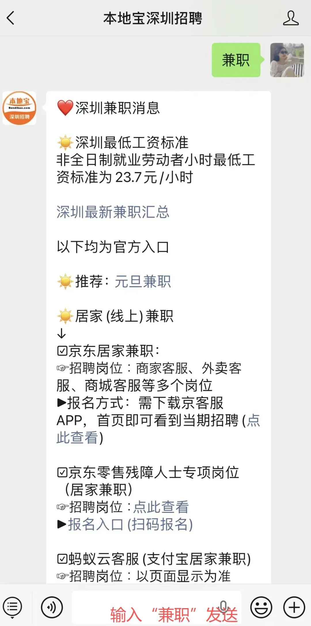 ⭐推荐服务:点击下方卡片,关注【本地宝深圳招聘】公众号,发送【京东】,即可获取京东云客服兼职招募岗位+报名入口,还可以查看京东社会招聘报名入口