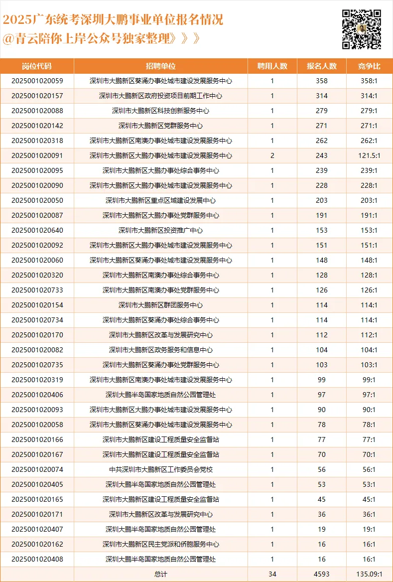 25广东统考事业单位深圳大鹏累计招聘34人,最终报名人数为4593人