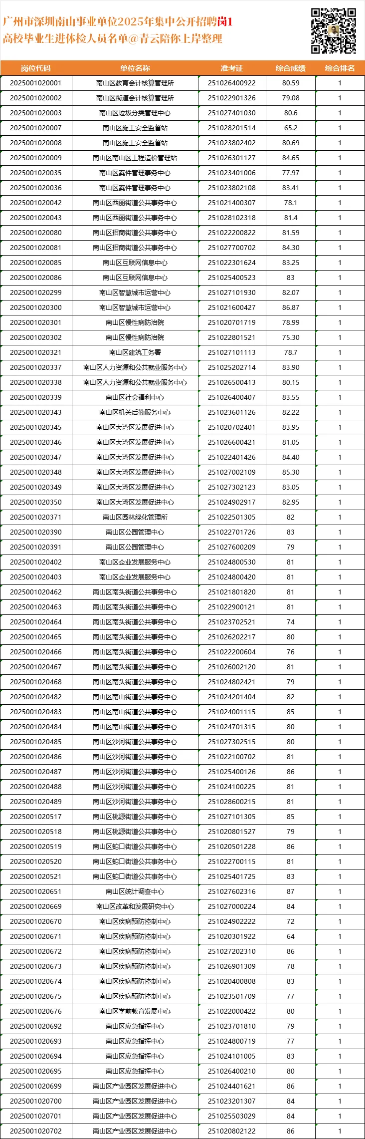 截止目前,南山区只公布最终进入体检分数,未公布进面人数和分数,所以无法统计进面分分差。从最终进入体检人员的名单来看:
