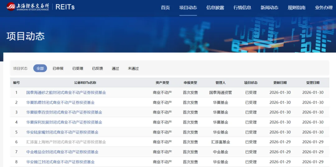 1月29日-1月30日,上海证券交易所(简称:上交所)官网显示,华安基金、中金基金、汇添富基金、华夏基金、国泰海通资管等五家管理人共上报8支商业不动产REITs,并均于当日获上交所受理。