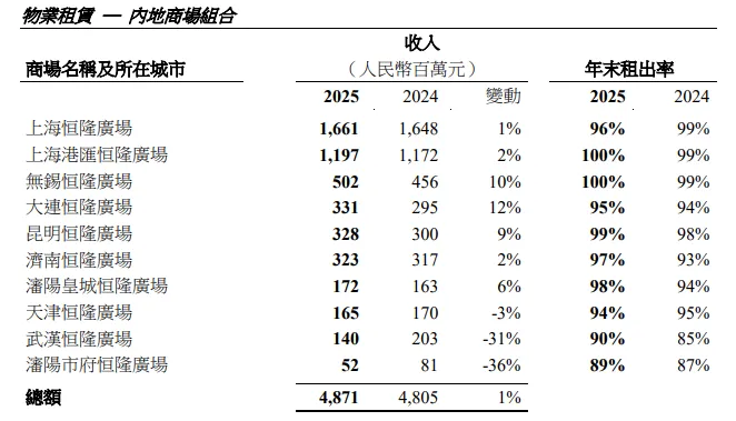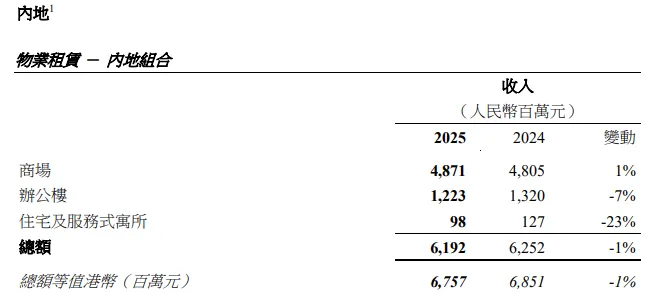 具体到商场方面,2025年,商场租户组合持续优化,整体租赁收入提升1%,租户销售额以人民币计值则按年上升4%。年末租出率改善2个百分点至96%。