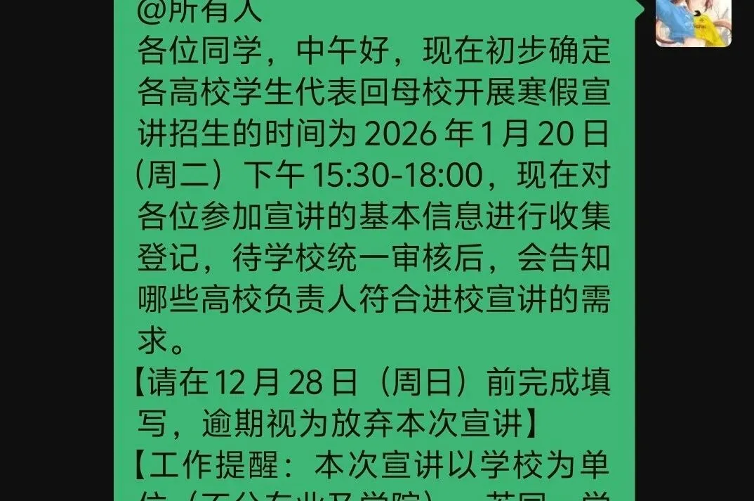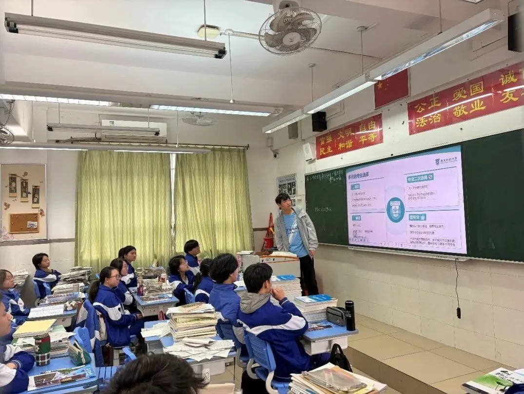 本次寒招严格围绕"进班宣讲、现场答疑、发放海报、引导加群"四大环节展开,覆盖多个高三班级,发放海报数百份,吸引众多学子加入咨询群,有效提升了广财在四中的影响力,为考生提供了精准的招生信息和备考指导。