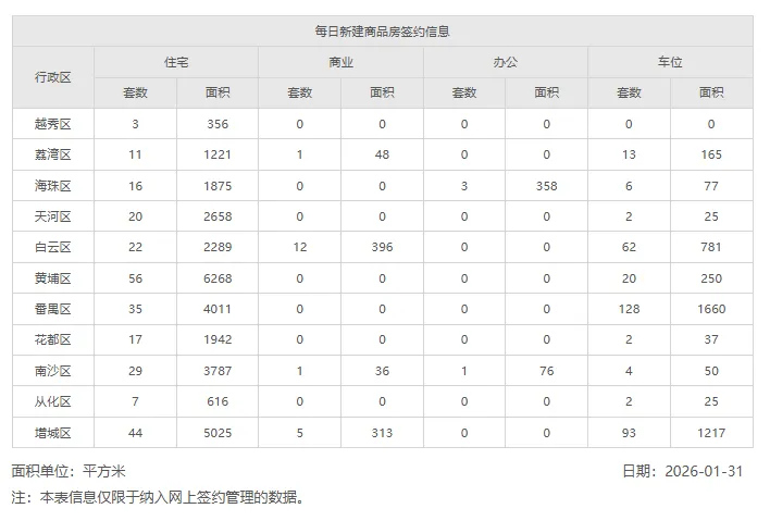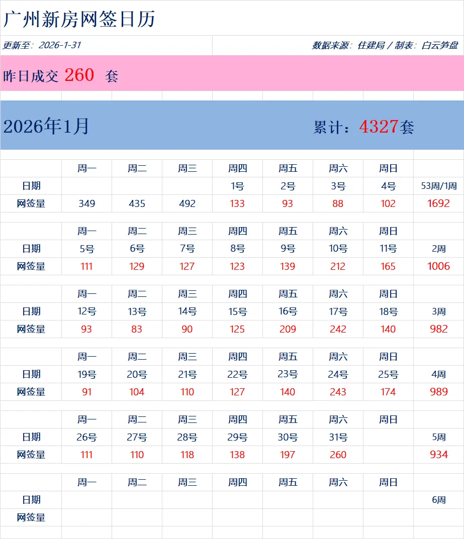 1月31日,广州新房网签 260 套,本月目前累计新房网签 4327 套。