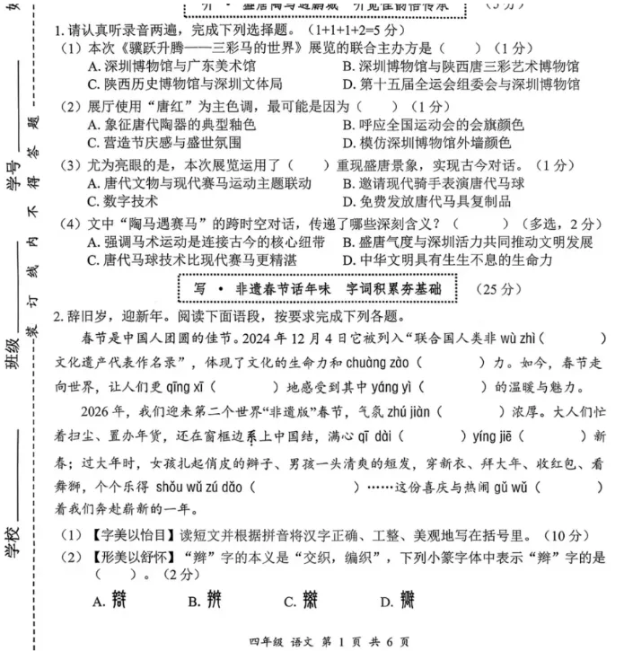 网传罗湖区四年级的语文试卷,命题围绕丙午马年“驭马探文趣”活动展开,融入传统文化元素。
