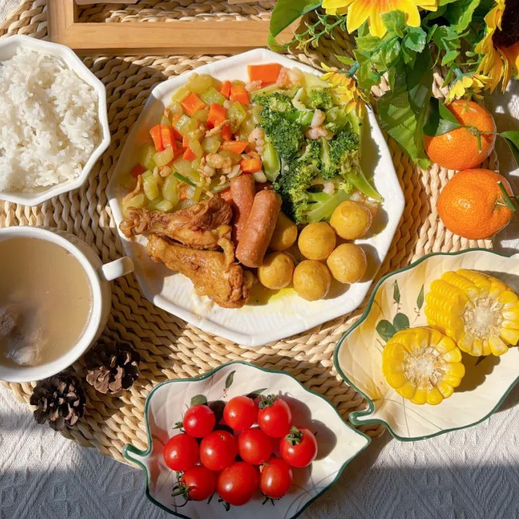 菜心炒肉、黄豆海带大骨汤
