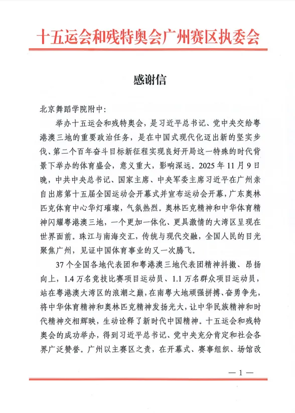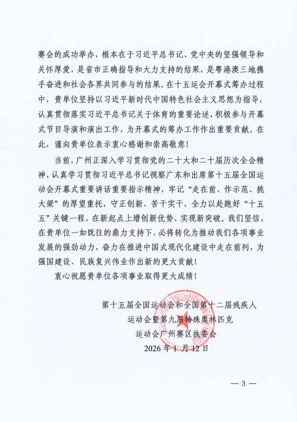 近日,我校收到第十五届全国运动会和全国第十二届残疾人运动会暨第九届特殊奥林匹克运动会广州赛区执委会发来的感谢信,对学校的全力支持致以诚挚谢意。
