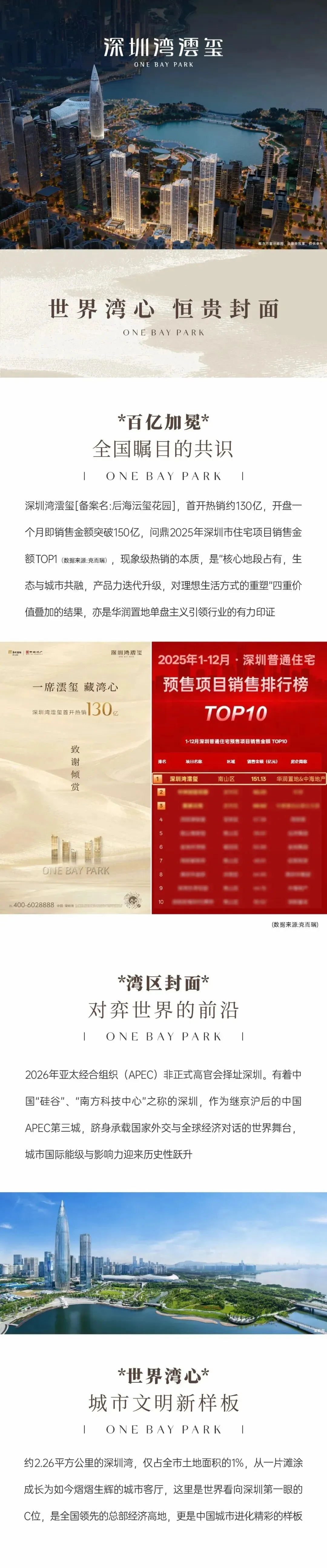 本资料对项目周围环境、交通、商业、文化教育、医疗设施及其他市政设施的介绍,仅为提供相关信息,不意味着本公司对此做出任何承诺,所有内容均以政府最终审批文件和买卖双方签署的买卖合同为准。本资料基于2026年1月前所获取项目规划方案制作,图片为示意图非实景图,仅做示意参考,并不视为商品买卖合同的内容或交付标准和条件,后期可能存在变化。我司保留对图片/视频修改的权利,敬请留意最新资料。项目推广名为【深圳湾澐玺】,备案名为【后海沄玺花园】,预售证号:深房许字(2025)南山009号,本资料发布时间为2026年1月, 开发商名称:深圳市润海发展房地产有限公司。