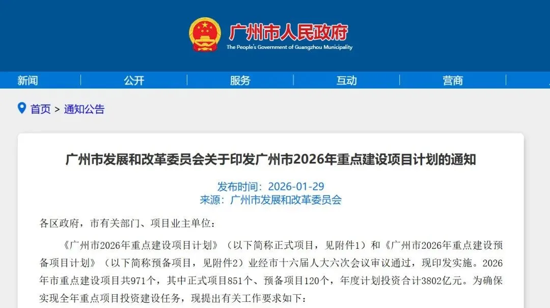 1月29日,广州发改委正式印发广州市2026年重点建设项目计划。