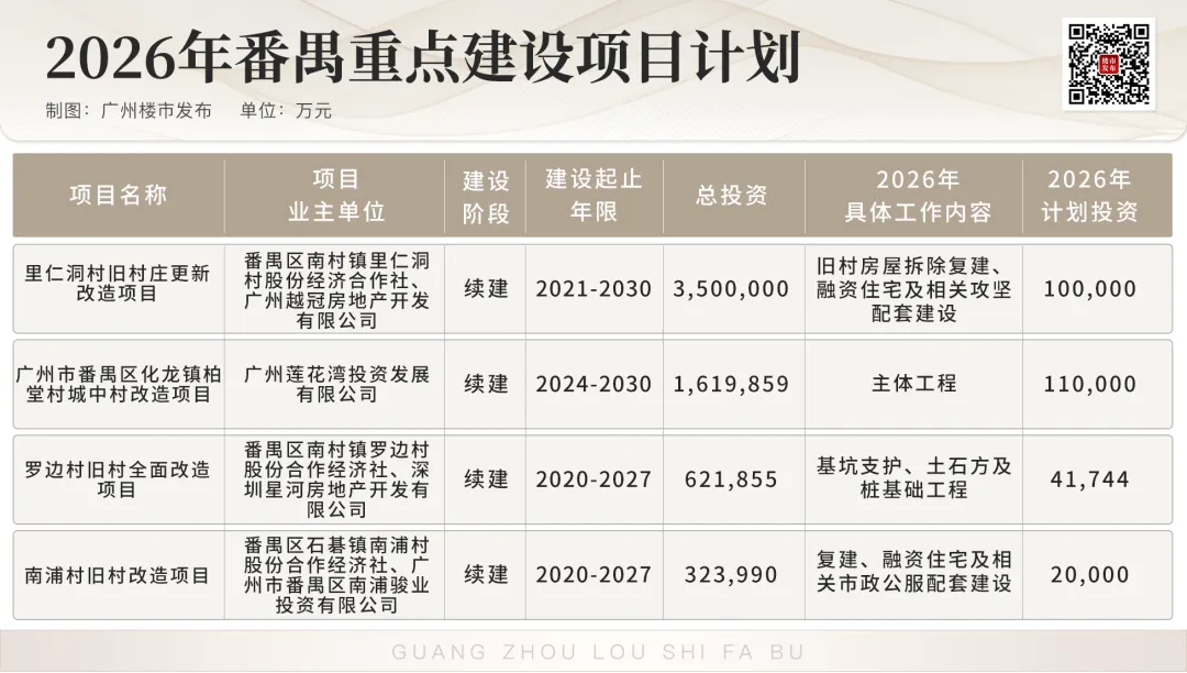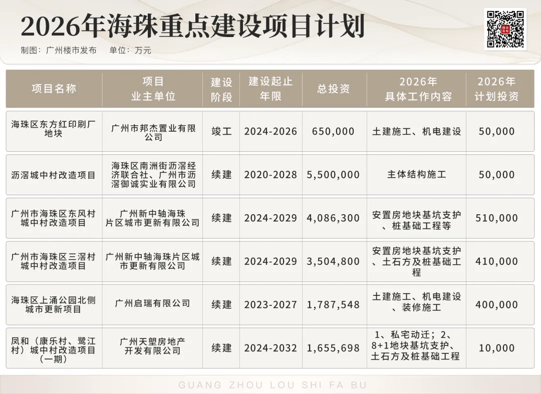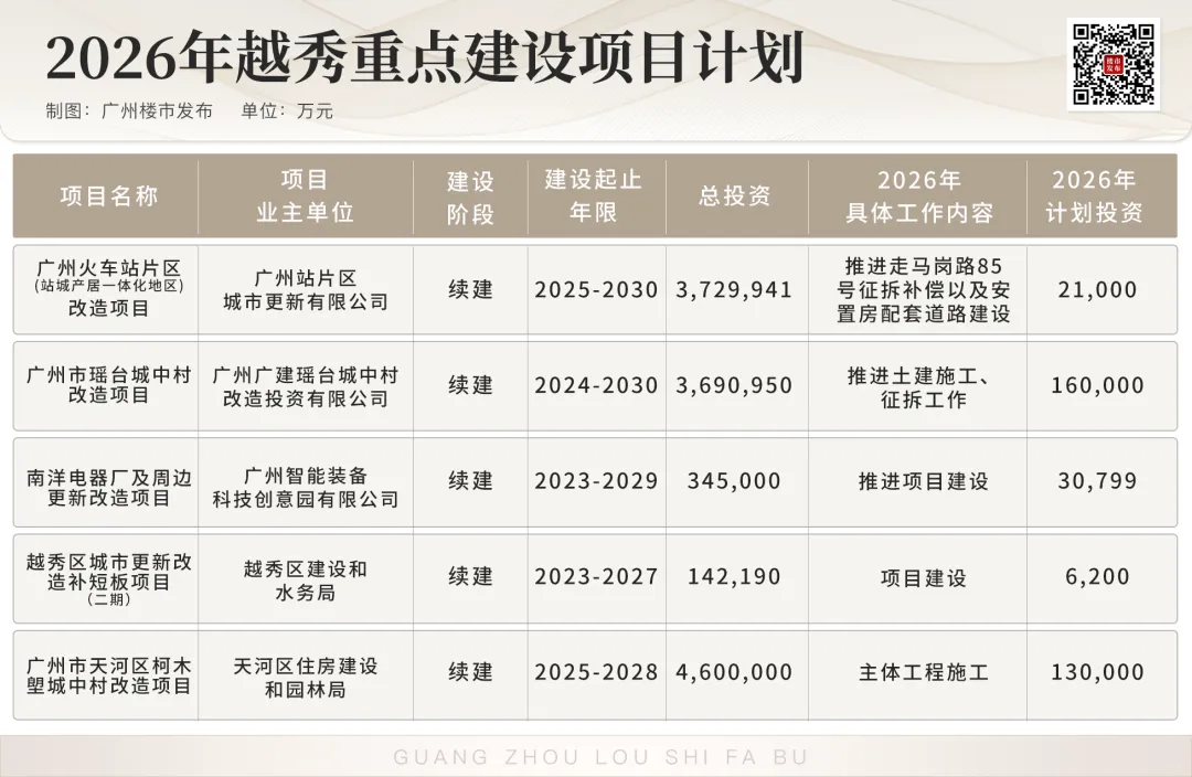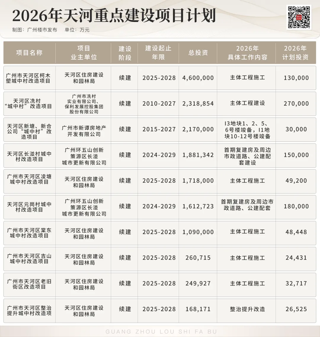 比如投资额达2319亿元的冼村改造,2026年主要还是推进主体工程建设,对珠江新城的重要性不言而喻。