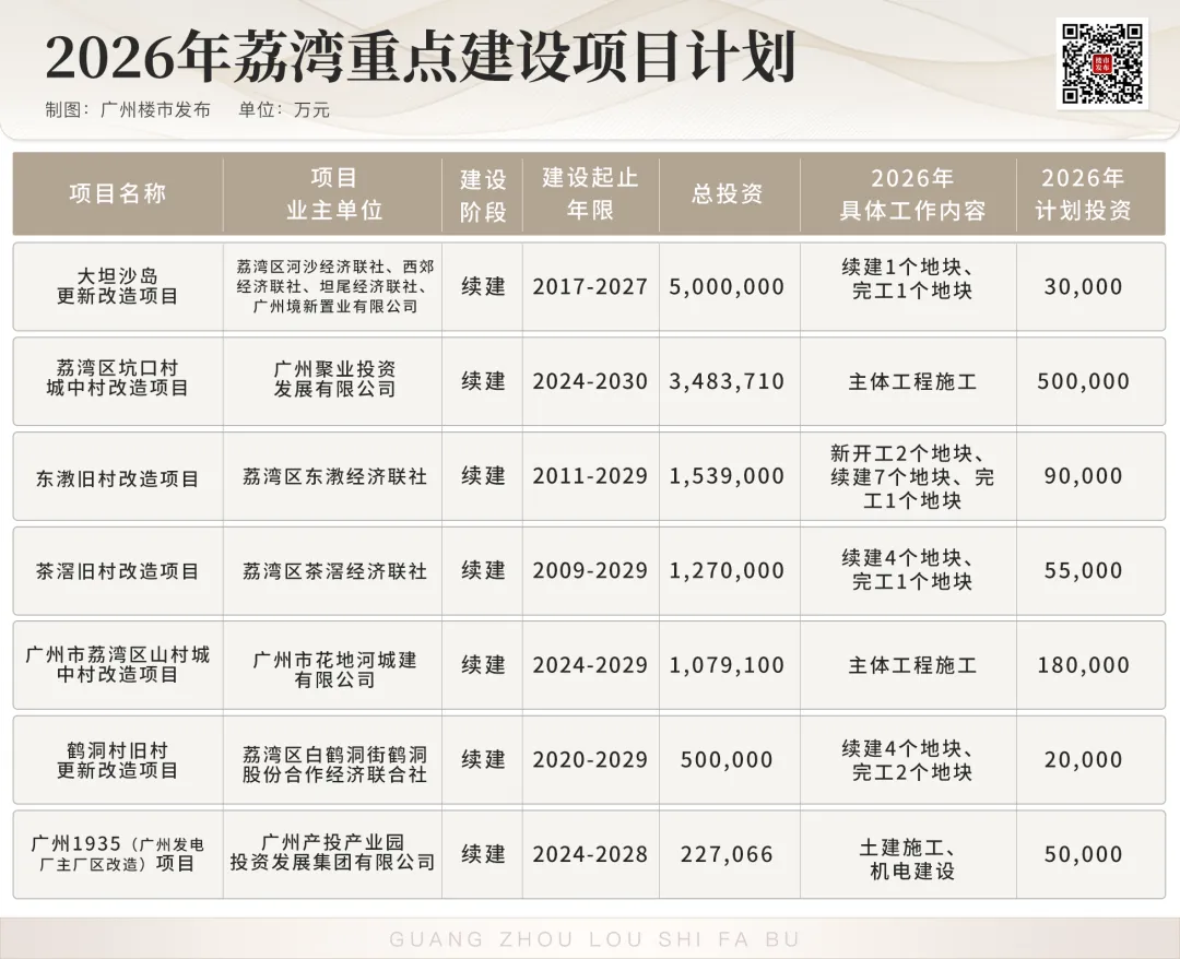 ③荔湾区:涉及7项旧改,含大坦沙、坑口等大体量项目。