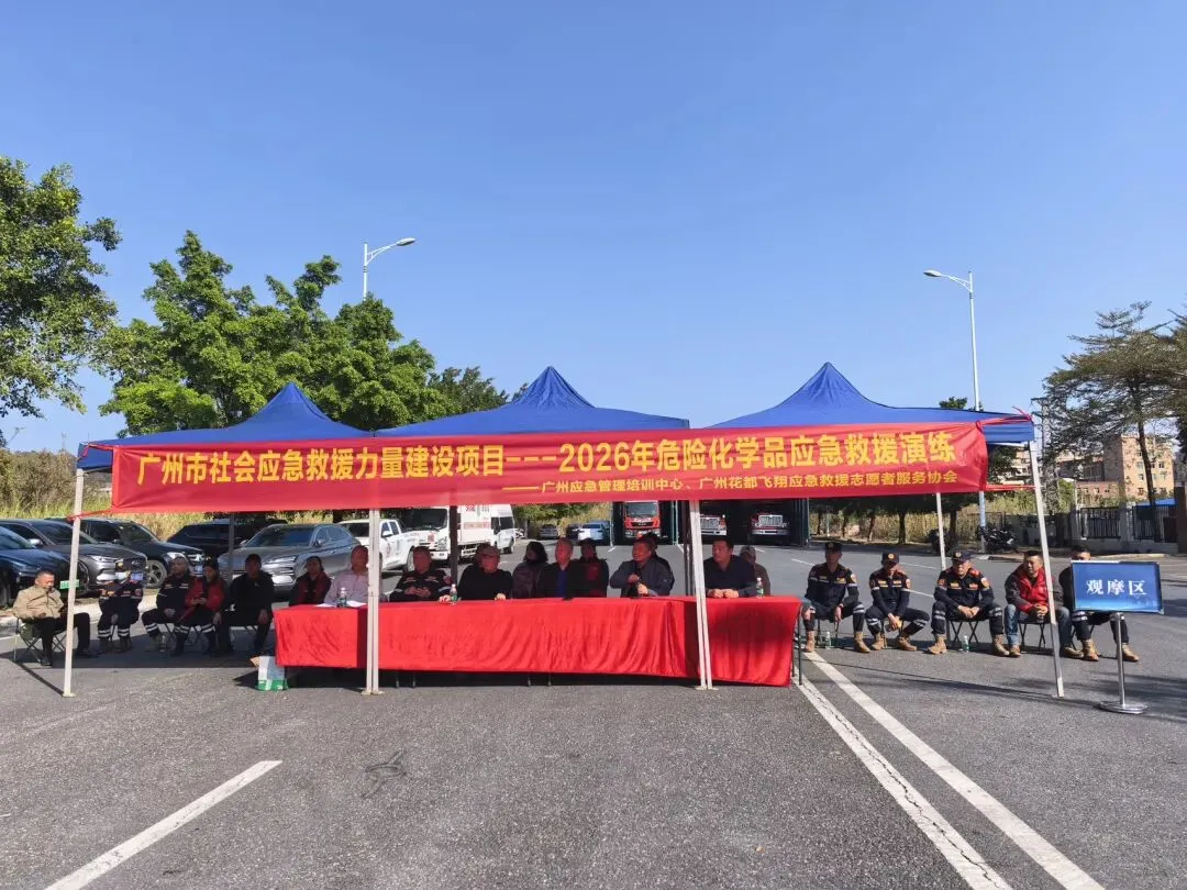 为提升社会应急救援力量应对危险化学品事故的处置能力,2026年2月1日,由广州市应急管理培训中心与广州花都飞翔应急救援志愿者服务协会联合主办的“广州市社会应急救援力量建设项目——2026年危险化学品应急救援演练”顺利举行。演练模拟了危险化学品运输车辆泄漏的突发事件,全面检验了队伍的快速响应、现场处置和协同作战能力。
