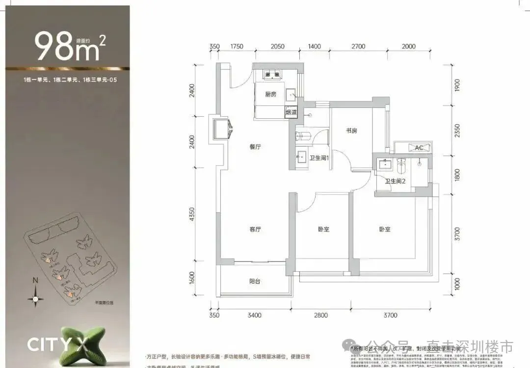 98㎡的3房2厅2卫,1栋1/2/3单元03.05户型/3栋的98平户型,设计的是经典竖厅格局,进门入户玄关,客厅3.4米开间,LDKB一体化,S墙设计预留冰箱卡槽位,三开间朝南,动静分区,3个卧室分别做到了主卧14.3㎡/次卧10.36㎡/次卧6.75㎡(包含墙体飘窗),U型厨房,公卫三段式分离,得房率约74.6-75.4%(不含赠送),东南或西南朝向。套内面积74.09㎡+赠送面积11.13㎡=实得85.22㎡,加上赠送后得房率约86.96%。