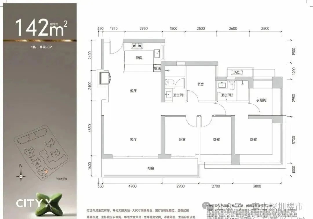 142㎡的4房2厅2卫,1栋1单元02户型,设计的是经典竖厅格局,进门入户玄关,客厅4.7米开间,LDKB一体化,S墙设计预留冰箱卡槽位,四开间朝南,动静分区,4个卧室分别做到了主卧24.03㎡/次卧9.99㎡/次卧8.99㎡/次卧7.6㎡(包含墙体飘窗),U型厨房,公卫三段式分离,得房率约75.4%(不含赠送),客厅连接次卧出12.16㎡的观景大阳台,东南朝向。套内面积107.06㎡+赠送面积14.75㎡=实得121.81㎡,加上赠送后得房率约85.78%。还未推售