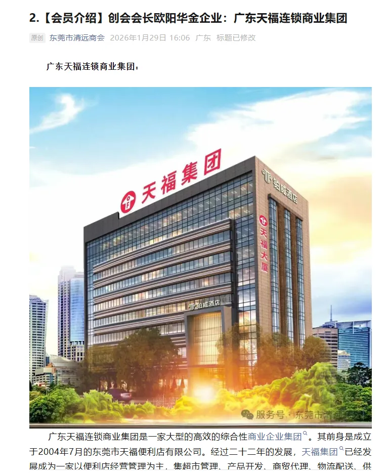 近日,东莞市清远商会通过官方服务号发布专题报道,聚焦商会创会会长、天福集团董事长欧阳华金先生及其领军的天福集团,全方位展现优秀会员企业的发展实力与责任担当,传递会企同心、共促发展的正能量。