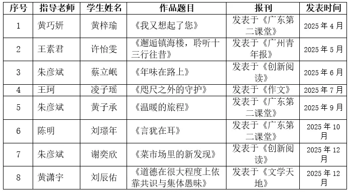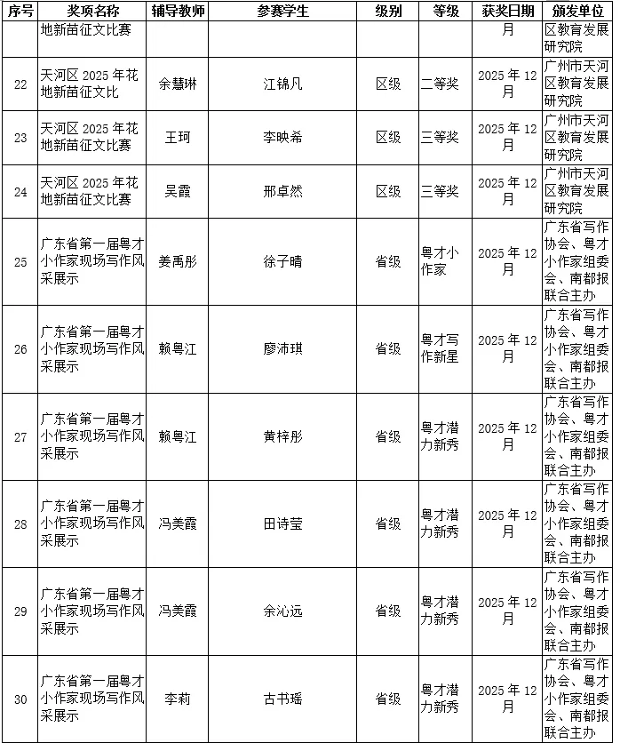 此外,郭昊佳、王祢雅、庄安志、周玥彤、翟刘筱妍、寻冰弦、谢奕欣、杜佳湉与陆煊宇等同学们在广东省“筑梦现代化,共抒爱国情”中小学主题作品征集活动、广东省中小学“暑假读一本好书” 活动、广东省中小学寒假书信活动、广州市“中国梦 延安情”中小学生革命传统教育红色文化微作文、“英雄花开英雄城”花城红色故事讲述大赛、“花地新苗”、天河区“粤韵杯”及科普科幻作文等比赛中荣获佳绩。黄梓瑜、许怡雯、蔡立岷、凌子瑶、黄子承、刘璟年、谢奕欣、刘辰佑等同学的作品更在《广东第二课堂》《创新阅读》《广州青年报》等报刊发表,书写了属于自己的文学印记。
