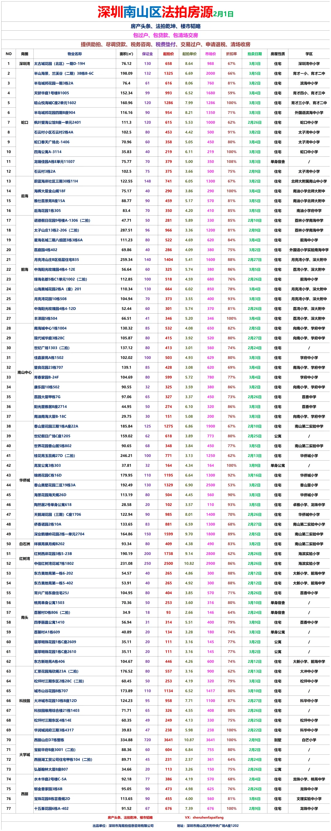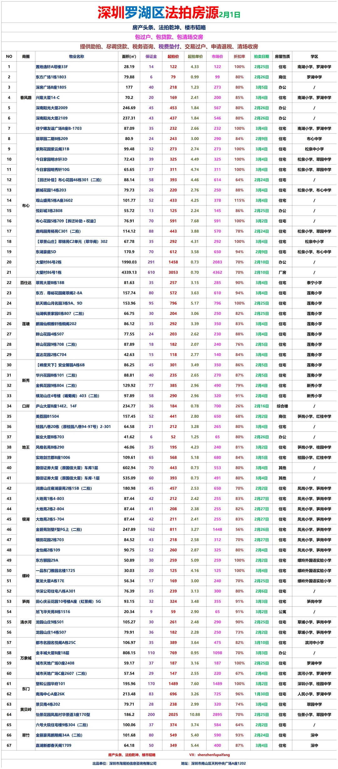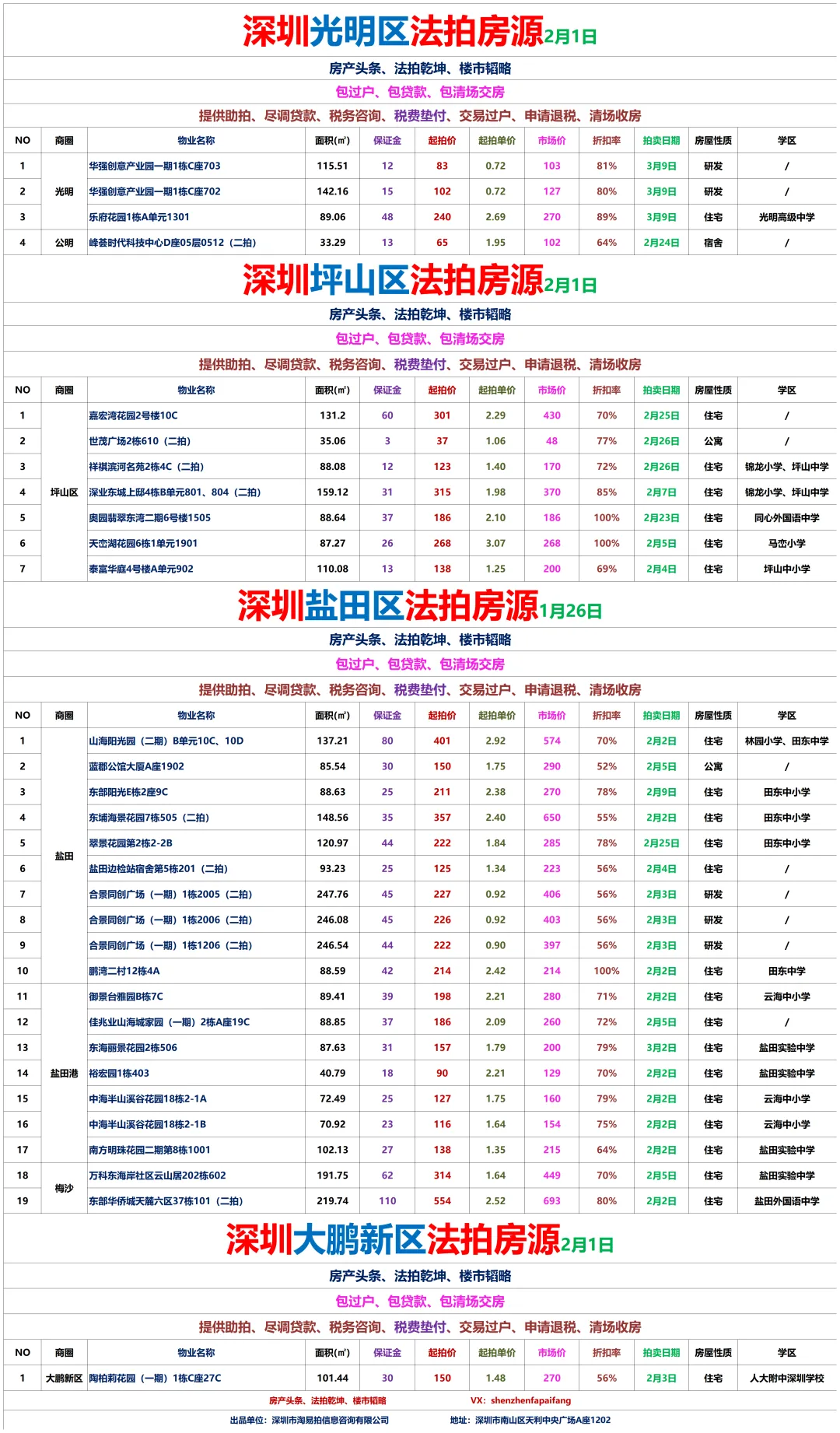 1、地产同行、房产自媒体、金融贷款、保险、微商营销人员等有行业冲突人员,禁止入群!一经发现立刻移出群聊,面斥不雅。3、拼单、砍价、优惠券、投票以及分享等才能送流量、领红包等。4、紧急需扩散的信息,请征得群主或管理员同意后再发布。深圳法拍房:南山区、宝安区、福田区、罗湖区、龙华区、龙岗区、坪山区、盐田区、大鹏新区各区拍卖房每周房源更新汇总