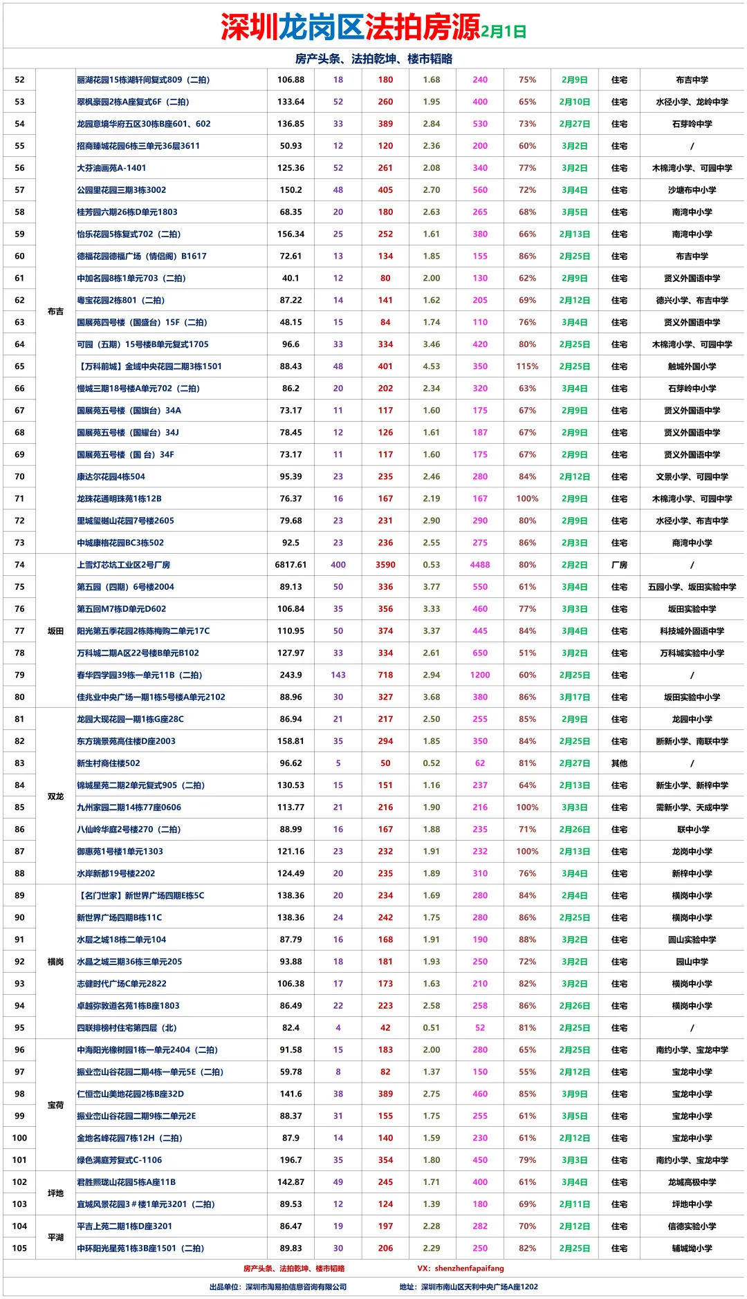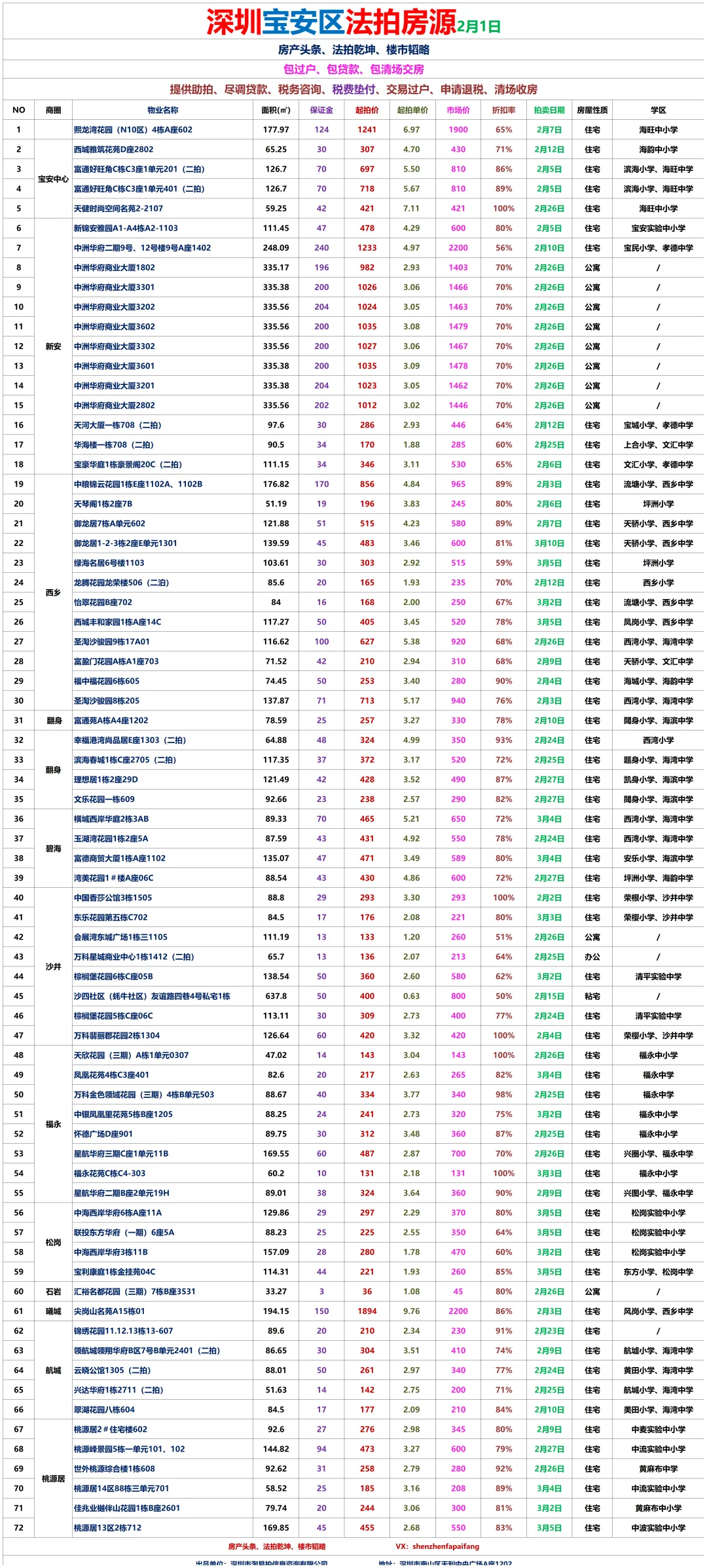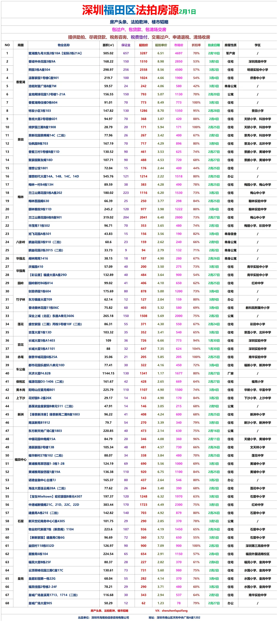 1、地产同行、房产自媒体、金融贷款、保险、微商营销人员等有行业冲突人员,禁止入群!一经发现立刻移出群聊,面斥不雅。3、拼单、砍价、优惠券、投票以及分享等才能送流量、领红包等。4、紧急需扩散的信息,请征得群主或管理员同意后再发布。深圳法拍房:南山区、宝安区、福田区、罗湖区、龙华区、龙岗区、坪山区、盐田区、大鹏新区各区拍卖房每周房源更新汇总