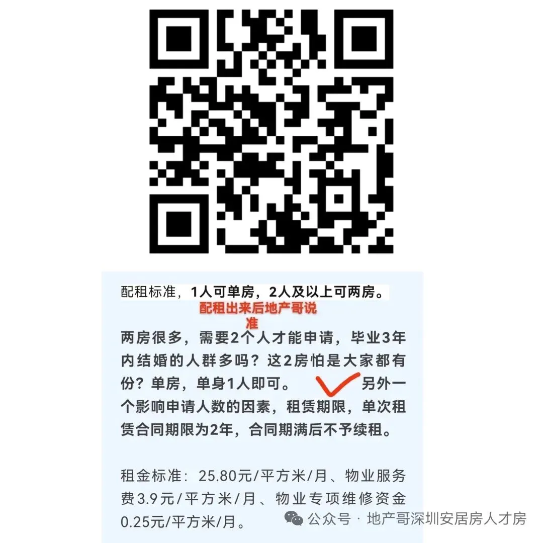 坝光核心启动区人才公寓项目,共计309套房源,其中,68套为建筑面积55-61㎡的两房,100套为建筑面积69-73㎡的小三房,141套为建筑面积85㎡以上的三房。申请条件非常宽松:第一队列,深圳社保正常缴纳且累计1年以上;第二队列深圳社保正常缴纳就行。2人家庭可申请55-61㎡的两房户型住房或69-73㎡的小三房户型3人及以上家庭可申请55-61㎡的两房户型、69-73㎡的小三房户型、或85㎡以上的三房户型。三、第17批龙岗区级保租房,待选房,人人有份,选不完深圳第17批保租房,龙岗绿海山河逸居保租房,合格名单出炉。根本选不完。总计360套房源,吸引了1965户家庭认租。但是资格审核合格家庭只有282户,360套房!选不完呀单身公寓144套,认租家庭1188户,合格家庭只有253户,人人有份两房户型216套认租家庭777户。合格家庭仅仅29户。对于龙岗其他家庭来说是好消息,能剩200套左右两房,后面有机会拿出来配租,申请条件预计不会那么“严格”。绿海山河逸居项目(以下简称“项目”)位于园山街道龙岗大道1026号,共360套住房,均为简装并配置部分家私家电(见附件1),其中建筑面积约40平方米的单身公寓144套,建筑面积约70平方米的两房216套,预计交付时间为2026年4月。租金标准:25.80元/平方米/月、物业服务费3.9元/平方米/月、物业专项维修资金0.25元/平方米/月龙岗京基御景荟都280套房源,已完成摇号,待选房。222套单身公寓及一房户型,认租合格家庭2056户,第一队列759户、第二队列912户、第三队列385户58套两房户型,认租合格家庭1176户,第一队列590户、第二队列332户、第三队列254户五、第14批光明区级保租房,等了很久了,下周公示合格名单,预计3月中旬选房光明区安居嘉禧苑,虹霓轩项目,共计1274套面向个人家庭配租,已完成摇号待公示选房,共计9901户家庭认租。深圳保租房最低申请条件:不限户籍,深圳社保1年以上+满足人才迁户标准即可。关注地产哥深圳安居房人才房公众号,不错过深圳保租房配租信息。有需要的家庭可以加地产哥专属付费会员,一对一保障。需要咨询保租房的家庭,可以添加地产哥微信,加入地产哥保租房付费会员,享受专属会员服务。获取深圳保租房待配租房源明细,一对一指导申请保租房、一对一解答,根据你的需求提供专业定制化服务,不会错过保租房消息。深圳各区待配租的6折保租房, 地产哥为大家梳理了部分房源信息。仅供参考(实际配租项目、面向的配租对象等以住建局官网为准)。深圳各区待配租的6折保租房,地产哥已发文介绍的28个项目:大家可以点击蓝色字体往期发文链接查看。宝安区:万科未来之光、松溪家园、越秀瑞樾府、雍境名邸