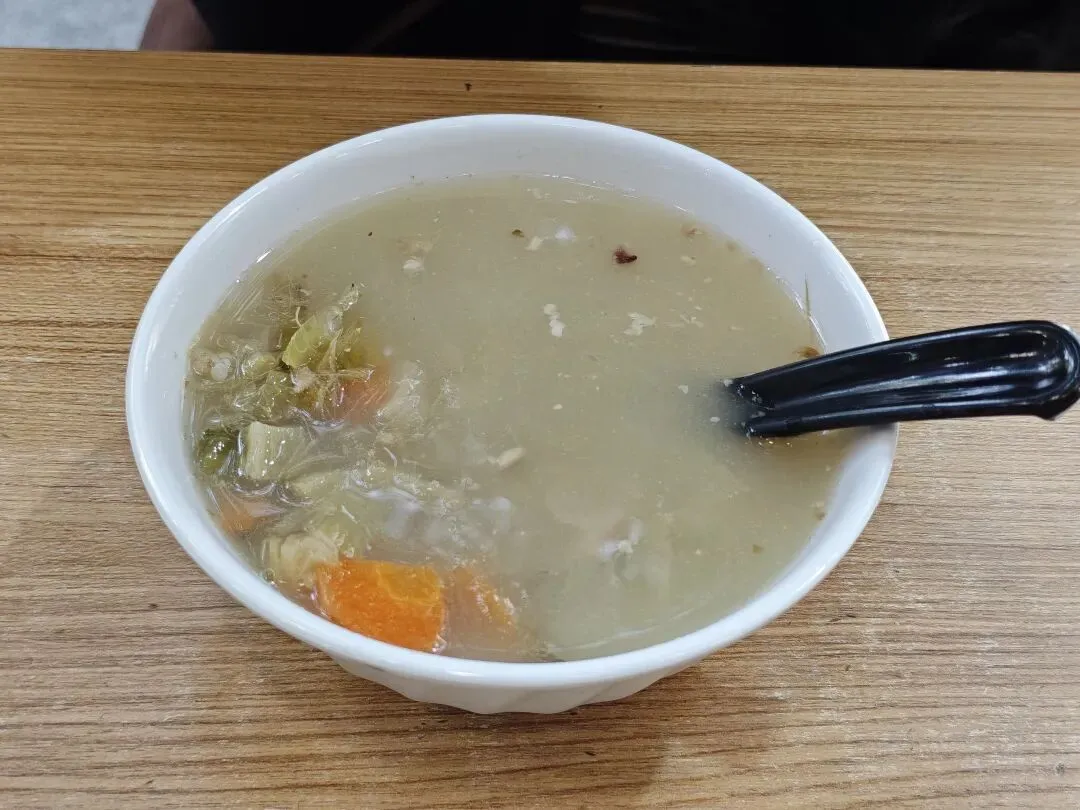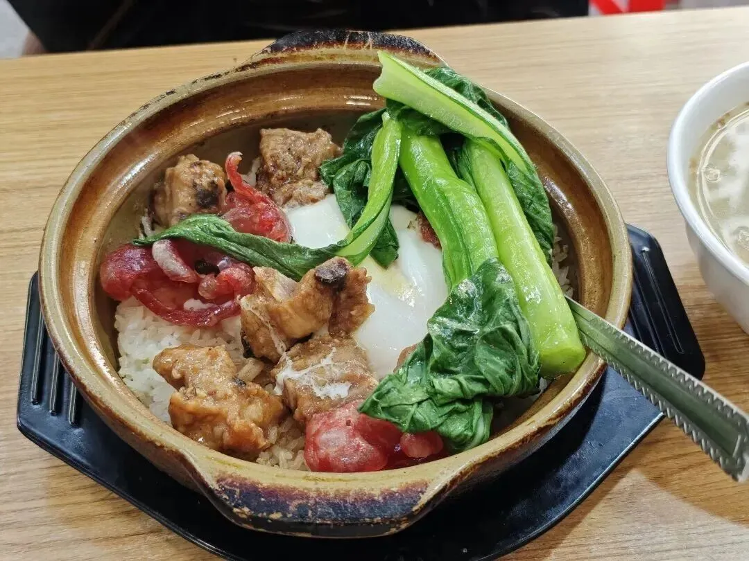 久闻竹升面的名字,酒店楼下刚好有一家。这家的竹升面是用高筋面粉加上鸭蛋,经过多次反复压制最后制作出来。过热水一煮,变得很有韧性,出锅后撒上虾子,就是一道虾子竹升面。老板另外给配了一碗汤,和另外点的云吞汤底一样,上面撒上韭黄,虾味极浓。云吞用料不错,虾肉弹牙且带甜,一颗云吞里有好几只,吃得人心情愉悦。听说虾子这种食材产量较小,需要很多只母虾才可能得到一两,干拌进竹升面里,鲜掉眉毛。还没达到广东时,便在网上刷到一家炖品极为有名的店家。顺着社区小道拐过去,发现果然名头不虚,小小的一个店面,早已挤满大堆饮汤的食客,就连摆在店外的露天桌子,也是座无虚席。无奈只能继续往前走,不远处便有另一家社区小店,看起来人也不少,因为有座位我们便坐下了。嘴馋点下一份腊肠排骨双拼的煲仔饭,又去炖品店要一份走地鸡打包。果然跟着当地人扎堆是不会出错的,半大的走地鸡处理干净之后,放入打好孔中的椰子壳里隔水加热。以椰子水炖出来的鸡汤甘甜鲜香,比起椰子鸡火锅用的椰青水,老椰子还要更甜一点,最后连肉带汤全部吃完。煲仔饭现点现做,底下米粒放得并不算多,因而被明火赋予了厚厚一层脆锅巴。上面的配料味道都算不错(菜心稍老了一点点),卧上一个鸡蛋的火候也是刚刚好。后来好奇又点一份霸王花、胡萝卜加猪脊骨的例汤。霸王花似乎就是火龙果花,在云南偶尔能够买到新鲜的,据说非常甜,这家店用的则是霸王花干。煲仔饭店并不欢迎外食,如果带了其他地方的东西,最后需要自己处理垃圾,老板说这叫“垃圾分类”。既然如此,走的时候还是将骨头收拾到椰子壳里拎走。