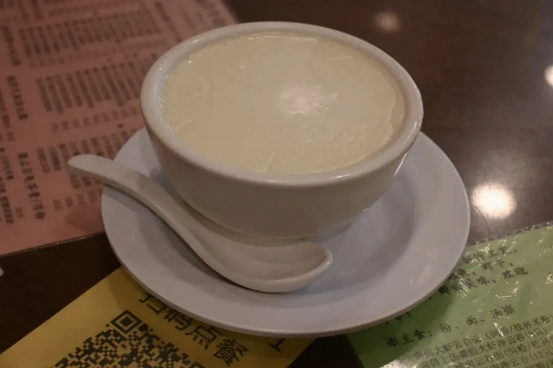 忽然又发现还没吃到大名鼎鼎的双皮奶。从陈家祠出来,在附近便找到一家老店。双皮奶使用的水牛奶油脂含量较高,因而更容易在表面凝结出一层奶皮。奶皮下的部分则由水牛奶加上蛋清和砂糖蒸制而成,口感顺滑而浓香。另一道“凤凰奶糊”我是第一次吃到,或许制作双皮奶剩下的蛋黄都加到这里了吧,吃起来还微微有点姜味。姜撞奶的原理在于用姜汁凝固热牛奶中的蛋白质,整个过程十分神奇,盖上盖子只三分钟,原本液体状的牛奶便可以托起勺子。眼大肚小,本来还想再叫一份杨枝甘露,但身体留出来的空间已经无法承载食欲,无奈只能离开。