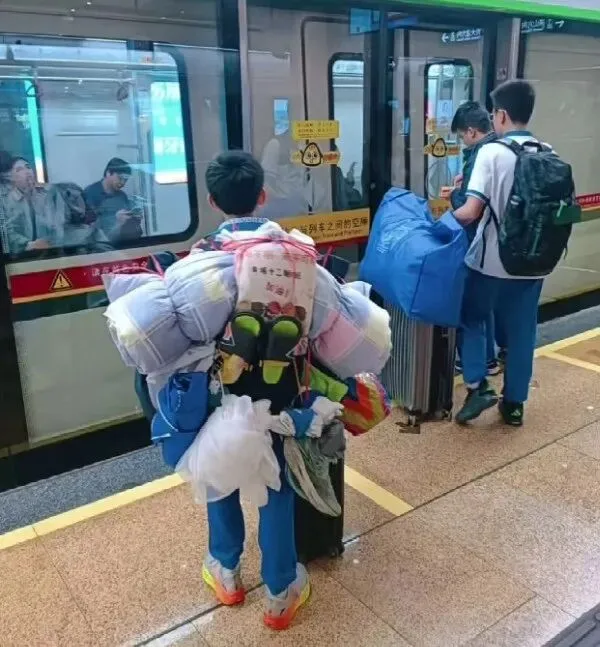 照片里,这个上中学的男孩,在同学的帮助下,花了20多分钟,用一根绳子把鼓鼓囊囊的行李打包好并捆在身上,然后自己背着,又拖着拉杆箱转地铁,辗转回家。