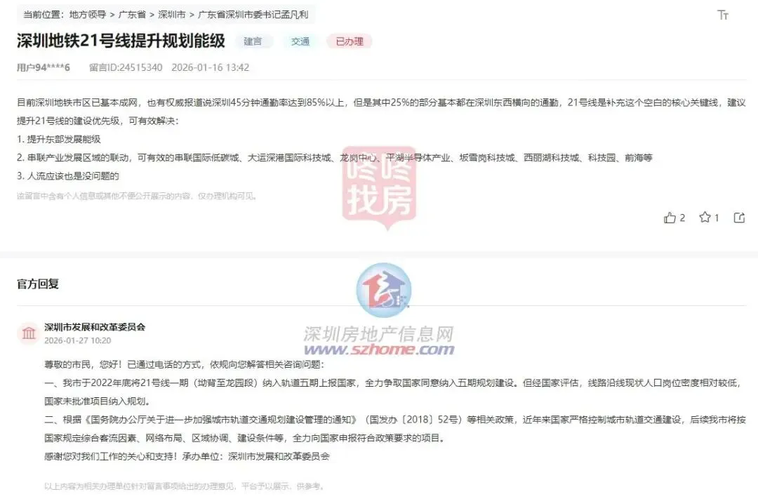 有市民通过人民网领导留言板留言,呼吁提升深圳地铁21号线的规划建设优先级,以填补深圳东西向快速通勤的空白,串联前海、南山科技园、龙岗等多产业片区,促进区域联动发展。
