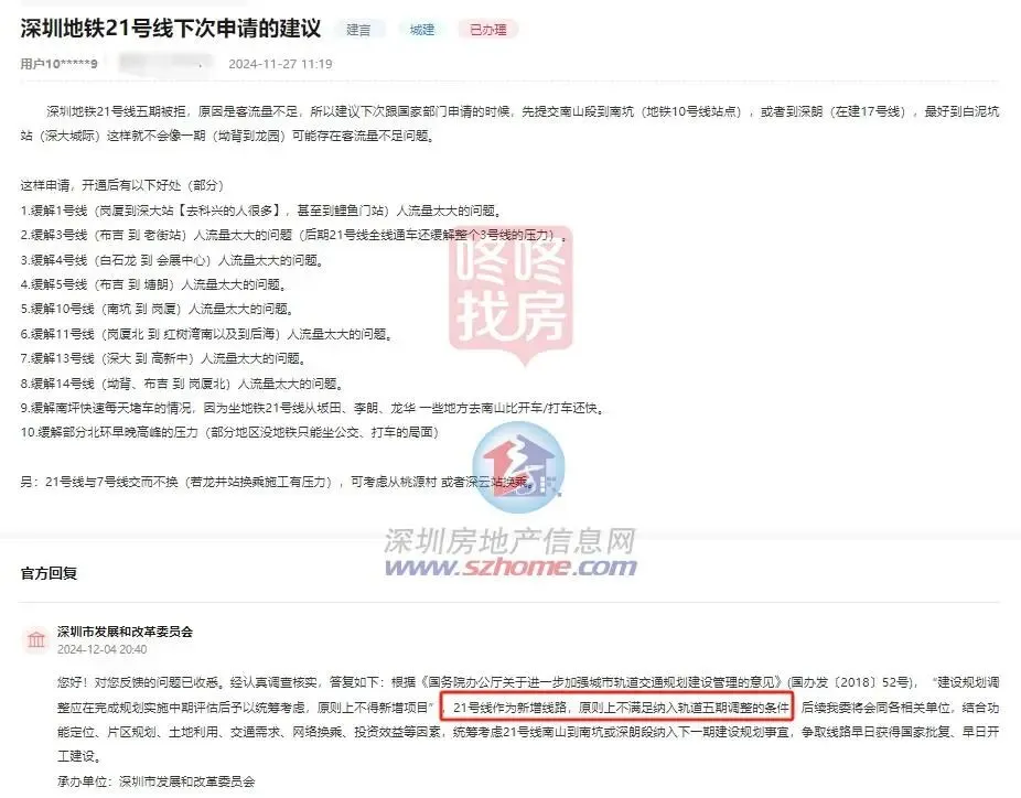 随后在2024年12月4日,深圳发改委在回复中表示,根据《国务院办公厅关于进一步加强城市轨道交通规划建设管理的意见》(国办发〔2018〕52号),“建设规划调整应在完成规划实施中期评估后予以统筹考虑,原则上不得新增项目”,21号线作为新增线路,原则上不满足纳入轨道五期调整的条件。