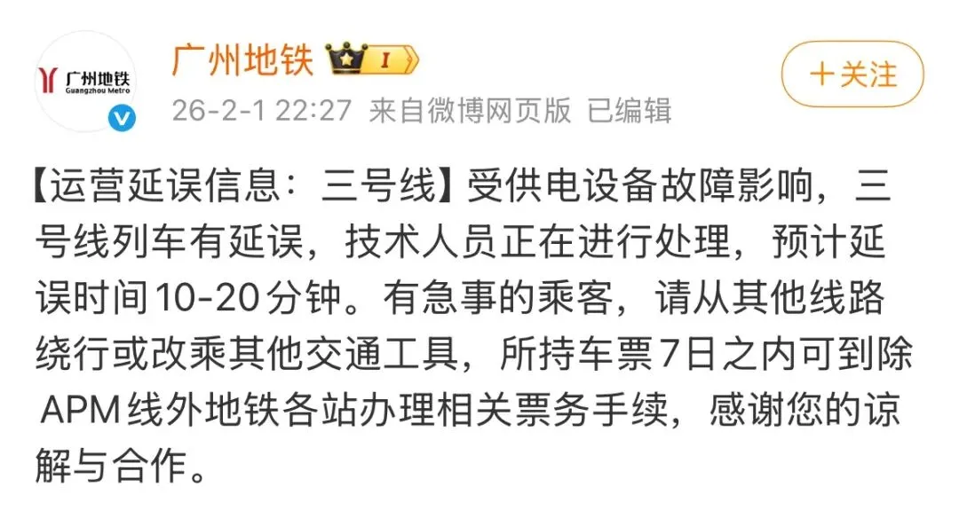 2月1日22时27分,广州地铁发布消息,