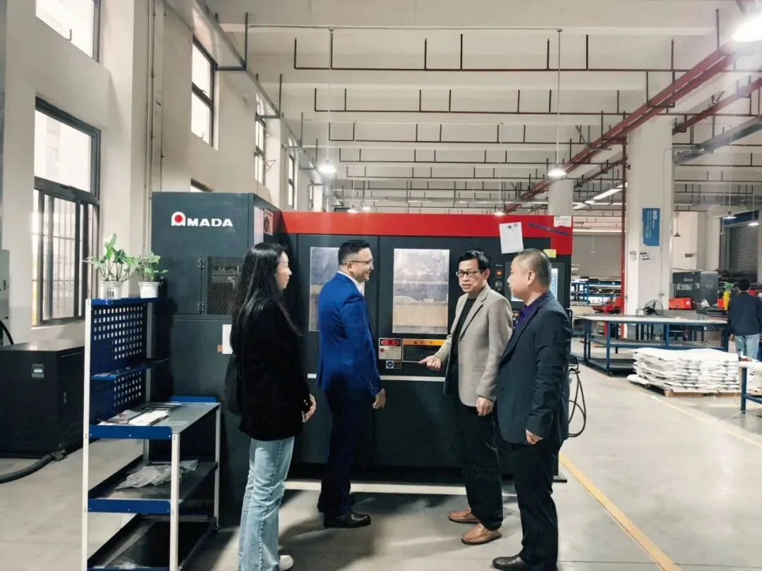 随后,考察团走进生产车间,映入眼帘的是排列整齐的CNC加工中心、镭射机、数控冲床、三坐标检测仪等先进设备,机械臂精准运作,工人们有条不紊地操作着精密仪器。“这是我们的医疗台车生产线,主要供应迈瑞、开立等头部医疗企业;那边是智能道闸和自动售货机组装区,产品出口到北美和欧洲。”李登文副会长边走边介绍,从精密机加件的数控走刀、CNC铣加工,到钣金件的镭射切割、折弯焊接,再到医疗器械的OEM/ODM成品组装,每一个生产环节都如数家珍,清晰展现出公司在医疗器械、智能设备领域的全链条制造能力。车间内的质量检测区,工作人员正通过二次元投影仪、高度仪等设备严格把控产品精度,“我们的机加零件精度能达到±0.005mm,钣金产品±0.03mm,满足医疗、航空领域的高要求。”李登文的介绍,让考察团对盟泰的智能制造实力有了直观且深刻的认识。