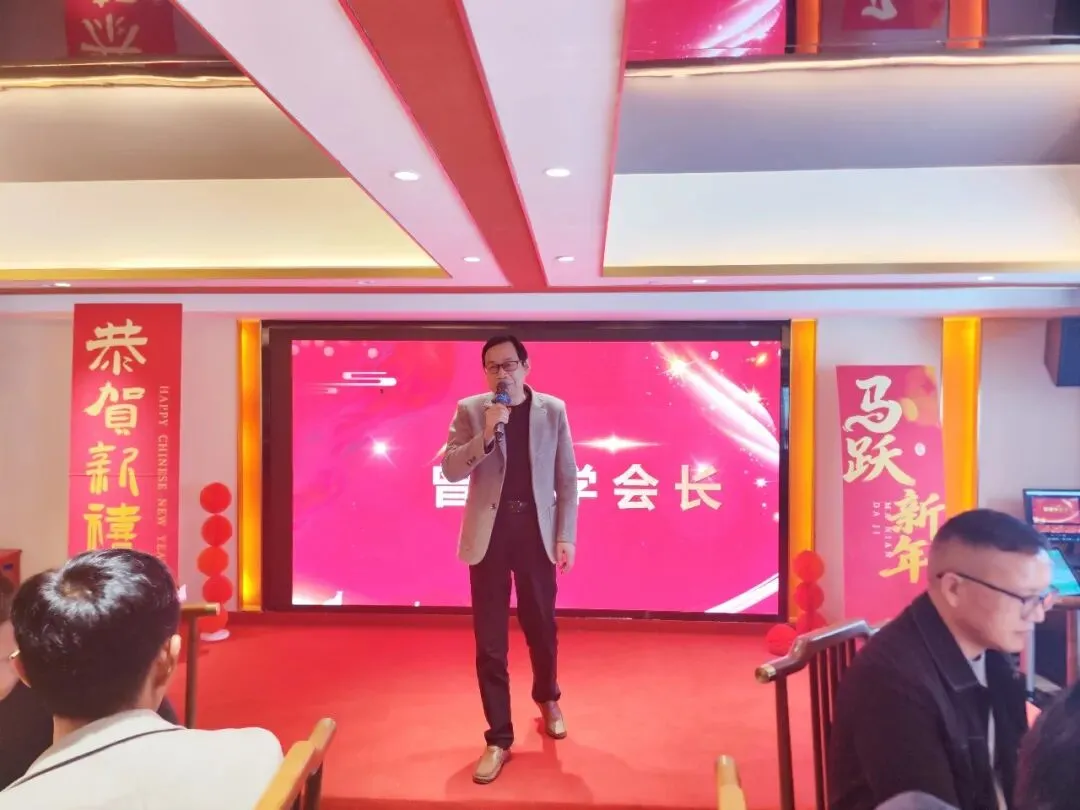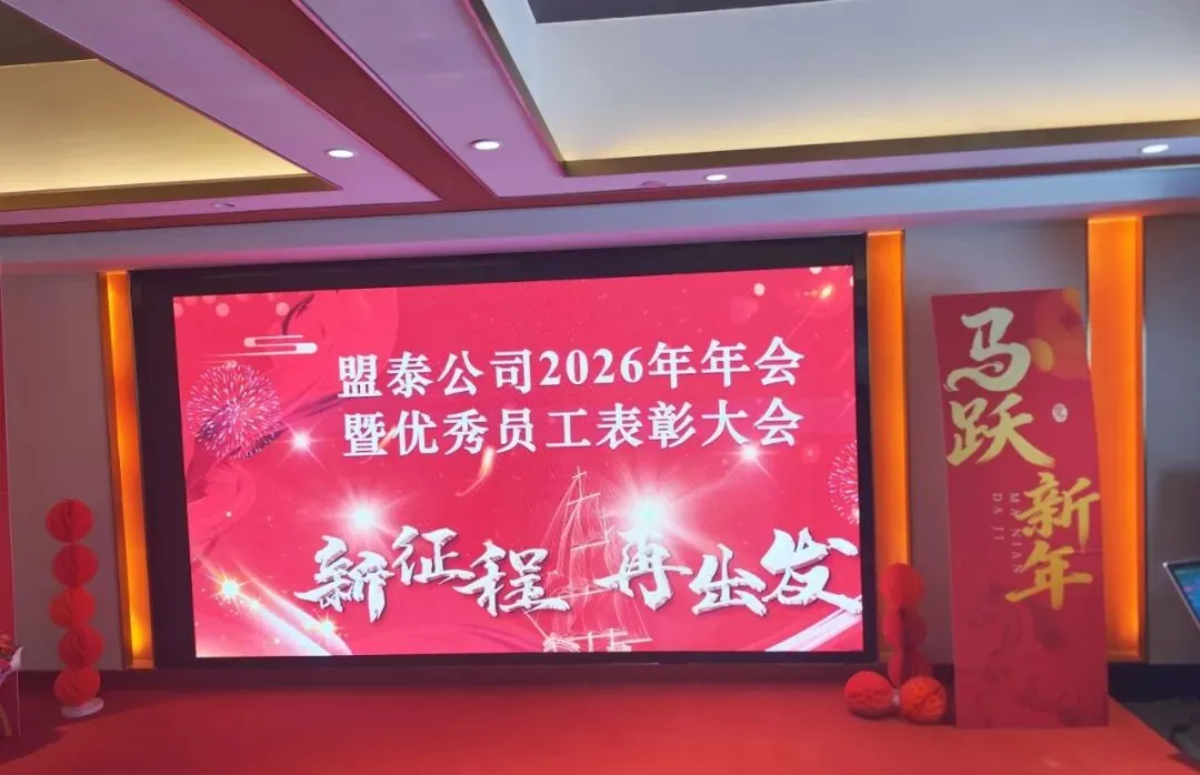 座谈结束后,曾胜学会长一行受邀参加盟泰公司2026年迎新春暨年度优秀员工表彰年会。当晚的年会现场灯光璀璨,“新征程 再出发”的主题背景板格外醒目,盟泰员工精神饱满地欢聚一堂。