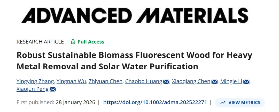 近期,深圳大学彭孝军院士团队在《Advanced Materials》发表的研究:“Robust Sustainable Biomass Fluorescent Wood for Heavy Metal Removal and Solar Water Purification ”。