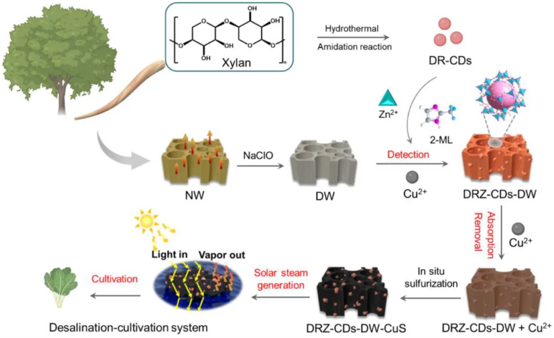 针对水体重金属污染与传统处理技术灵敏度低、易产生二次污染的问题,该研究以农林废弃物木聚糖为碳源合成荧光碳点(CDs),将其与 ZIF-8 复合后通过静电作用及螯合作用固定于脱木质素木材(DW),制备双功能复合材料 DRZ-CDs-DW,构建 “检测 - 吸附 - 转化 - 回用” 闭环系统。该材料对 Cu²⁺检测限达 2.3 nM,吸附容量为 298.72 mg/g;吸附饱和后经原位硫化转化为光热蒸发器 DRZ-CDs-DW-CuS,在 1.0 kW・m⁻² 光照下蒸发速率达 3.54 kg・m⁻²・h⁻¹,脱盐后产水符合灌溉及饮用标准。该研究实现了生物质资源高值化利用,为重金属污染治理与水资源循环提供了绿色高效的技术方案。