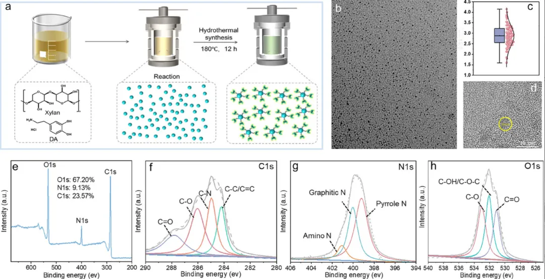 图2.D型碳点的合成与结构表征。(a) 木聚糖衍生的D型碳点水热合成示意图。(b) 所制备D型碳点的透射电子显微镜(TEM)图像,(c) 粒径分布直方图,以及(d) 高分辨透射电子显微镜(HRTEM)图像。(e) X射线光电子能谱(XPS)全谱以及(f) C1s、(g) N1s和(h) O1s的相应高分辨谱图。