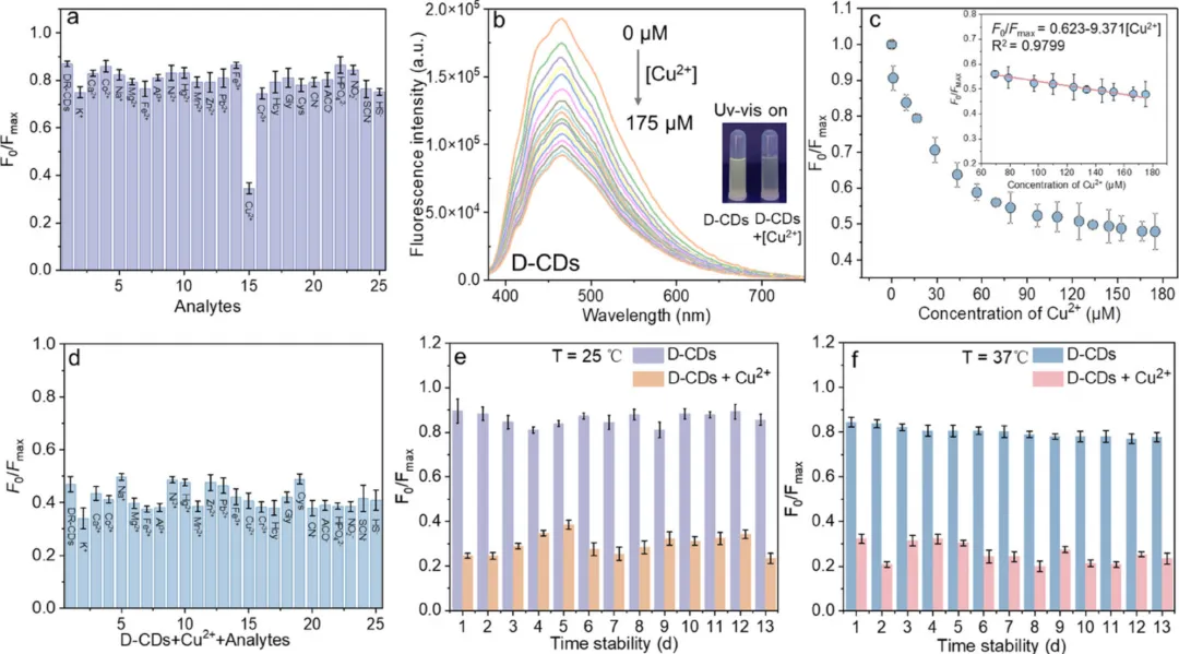 图3.D - CD对Cu²⁺和其他物质的荧光响应及选择性。(a) D - CD对各种物质的选择性(1:DR - CD,2:K,3:Ca²⁺,4:Co²⁺,5:Na,6:Mg²⁺,7:Fe²⁺,8:Al³⁺,9:Ni²⁺,10:Hg²⁺,11:Mn²⁺,12:Zn²⁺,13:Pb²⁺,14:Fe³⁺,15:Cu²⁺,16:Cr³⁺,17:同型半胱氨酸(Hcy),18:甘氨酸(Gly),19:半胱氨酸(Cys),20:CN⁻,21:ACO⁻,22:HPO₄²⁻,23:NO₂⁻,24:SCN⁻,25:HS⁻)。(b) 随着Cu²⁺浓度增加,D - CD的荧光滴定光谱。插图:可见光和紫外光照射下,添加Cu²⁺前后D - CD的照片。(c) 斯特恩 - 福尔默图(F₀/F)与Cu²⁺浓度的线性拟合。(d) 在存在竞争物质的情况下,D - CD + Cu²⁺体系的荧光响应(1:DR - CD,2:K,3:Ca²⁺,4:Co²⁺,5:Na,6:Mg²⁺,7:Fe²⁺,8:Al³⁺,9:Ni²⁺,10:Hg²⁺,11:Mn²⁺,12:Zn²⁺,13:Pb²⁺,14:Fe³⁺,15:Cu²⁺,16:Cr³⁺,17:同型半胱氨酸(Hcy),18:甘氨酸(Gly),19:半胱氨酸(Cys),20:CN⁻,21:ACO⁻,22:HPO₄²⁻,23:NO₂⁻,24:SCN⁻,25:HS⁻)。(e, f) D - CD和D - CD + Cu²⁺在(e) 25°C和(f) 37°C下F₀/F的时间依赖性稳定性。数据以均值±标准差表示(n = 3)。