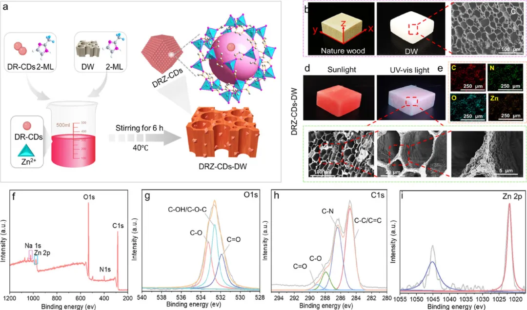 图5.荧光木材(DRZ - DW)的合成与结构表征。(a) DRZ - DW制备过程的示意图。(b) 天然轻木(左)和脱木质素木材(DW,中)的数码照片,以及DW结构的扫描电子显微镜(SEM)显微照片(右)。(d) DRZ - DW在日光(左)和紫外光(中)下的图像,以及对应的SEM形貌图(右)。(e) DRZ - DW的能谱(EDS)元素分布图。(f) 确认元素组成的X射线光电子能谱(XPS)全谱图。(g - i) (g)O1s、(h)C1s和(i)Zn2p区域的高分辨率XPS光谱图。