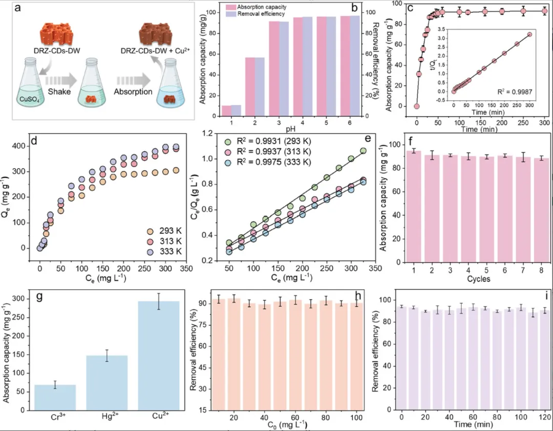 图6.DRZ-CDs-DW用于去除Cu²⁺的合成及吸附性能。(a) 用于吸附Cu²⁺的DRZ-CDs-DW制备过程示意图。(b) 溶液pH对Cu²⁺去除效率和吸附容量的影响。(c) Cu²⁺的吸附动力学(插图:准二级动力学拟合)。(d) 不同初始Cu²⁺浓度和温度下的平衡吸附容量。(e) Cu²⁺吸附的朗缪尔等温线模型拟合。(f) DRZ-CDs-DW在连续八次吸附 - 解吸循环中的可使用重复性。(g) 对Cr³⁺、Hg²⁺和Cu²⁺吸附容量的比较。(h) 不同初始Cu²⁺浓度下的去除效率。(i) 随时间变化的去除效率曲线。数据以均值±标准差表示(n = 3)。