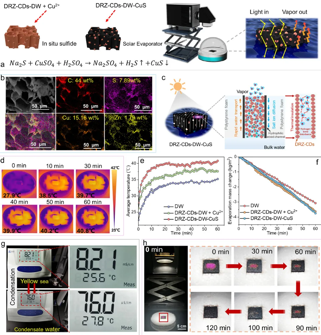 图7.DRZ - CDs - DW - CuS复合材料的制备及其太阳能蒸发性能。(a) DRZ - CDs - DW - CuS太阳能蒸发器制备过程的示意图。(b) DRZ - CDs - DW - CuS的扫描电子显微镜(SEM)图像及相应的能谱(EDS)元素映射图。(c) 高效太阳能驱动界面蒸发系统的工作机制。(d) 潮湿条件下DRZ - CDs - DW - CuS随时间变化的红外热成像图。(e) DRZ - CDs - DW - CuS、DRZ - CDs - DW + Cu²⁺和原始去离子水(DW)的平均表面温度对比。(f) DRZ - CDs - DW - CuS、DRZ - CDs - DW + Cu²⁺和去离子水随时间的蒸发质量损失。(g) 原始黄海海水和经DRZ - CDs - DW - CuS系统净化后水的电导率测量结果。(h) DRZ - CDs - DW - CuS表面原位盐溶解过程的可视化演示。