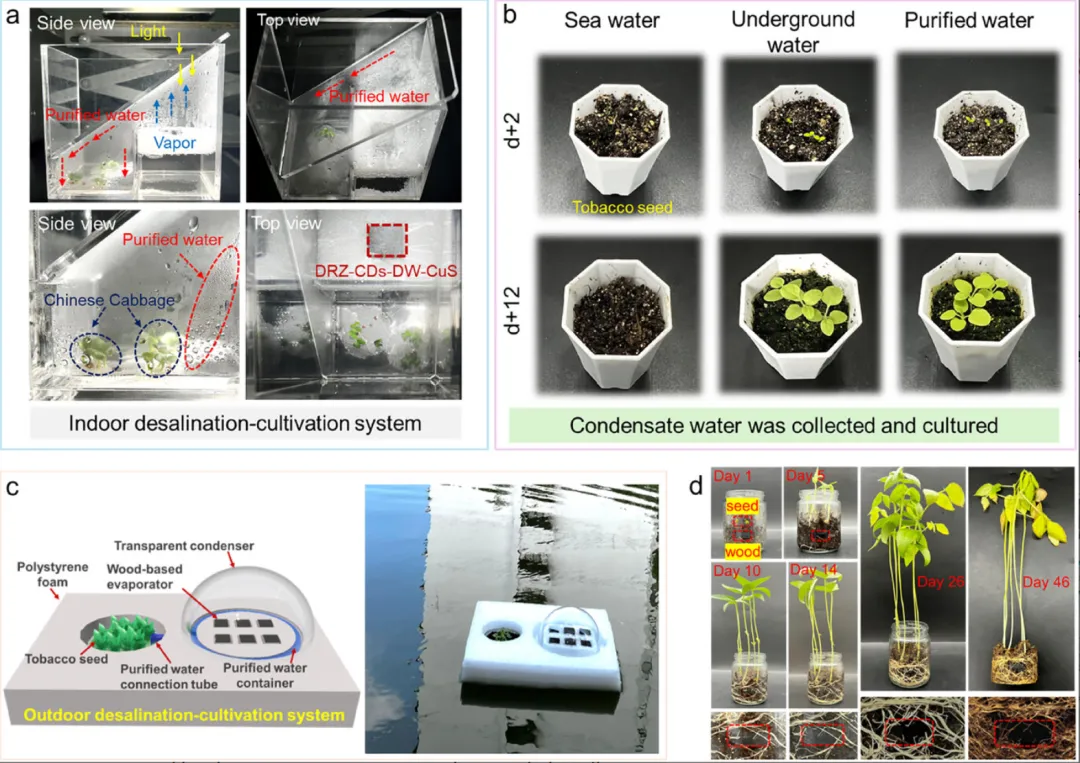 图8.基于DRZ - CDs - DW - CuS的太阳能海水淡化 - 种植系统。(a) 带有丙烯酸蒸发器、卷心菜植株和DRZ - CDs - DW - CuS材料的室内装置示意图。(b) 用海水、地下水和该系统产出的淡化水灌溉后绿豆的生长情况。(c) 室外系统设计示意图。DRZ - CDs - DW - CuS材料漂浮在湖面上。(d) 绿豆植物毒性测试,以评估DRZ - CDs - DW - CuS的环境安全性。