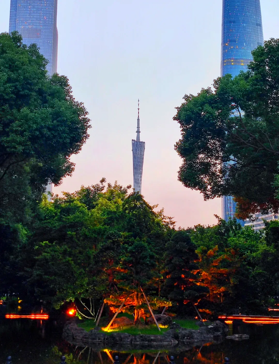 花城广场水池倒影,晚霞好看。