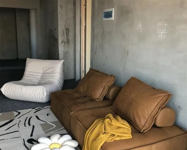 但又细看,地上铺了一块大地毯,上面随意摞着两个无腿沙发和毛球抱枕,懒人沙发一塌糊涂。我还纳闷怎么能住着舒服?结果小哥冲我乐:“平时追剧、刷视频、看书,直接一窝,小日子过得别提多自在!”这位小哥是真的把极简主义工业风,玩出了高级感。