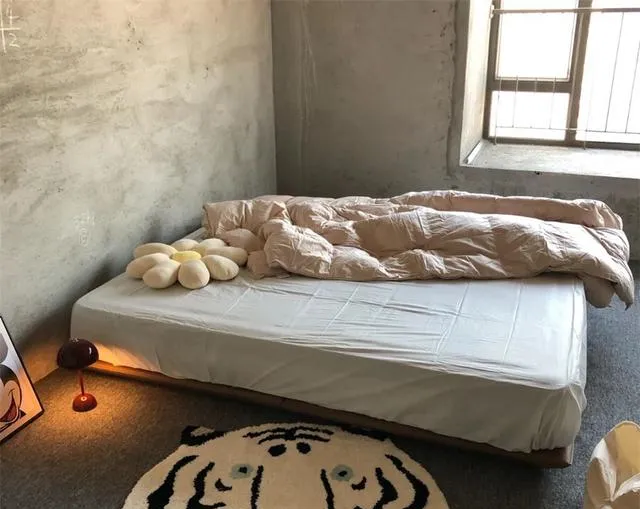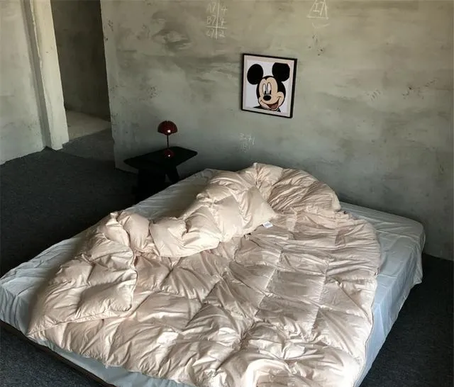 再瞅卧室,还是老套路——没有任何多余的家具。床垫直接往地上一放,铺上被子就能睡。旁边随意摆张小桌子当床头柜,落地台灯和可爱的米奇挂画一放,简直是快手版的北欧风!