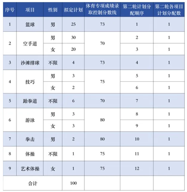 (五)我校各专业在项目二志愿录取未完成的情况下,将进行计划调整。同项目内男女间生源不均衡,优先在该项目中相互调整。其余仍未完成招生计划的项目,剩余的招生计划将优先调整至篮球、空手道、沙滩排球、技巧、跆拳道、游泳、拳击、体操、艺术体操项目。按照上述计划调整规则,若出现二志愿通过计划调整录取的考生其综合分等于或低于一志愿该项目最低综合分(计划调入的项目,一志愿上线考生已被我校全部录取的情况除外)的情况,计划将调整至下一个项目,直至没有可被调整到的项目为止。