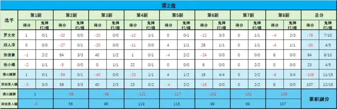 第1盘第2副:张俊豪(深圳美人蝎)胡张小蝶(深圳美人蝎)点,,打1鬼无鬼;邱人泽(佛山醒狮)自摸,海底七对,打2鬼有鬼