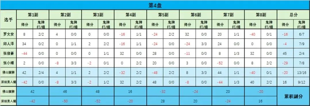 第1盘第4副:罗文安(佛山醒狮)自摸,门清混一色,打3鬼有鬼;张俊豪(深圳美人蝎)胡张小蝶(深圳美人蝎)点,门清,无鬼;张小蝶(深圳美人蝎)自摸,混一色,无鬼