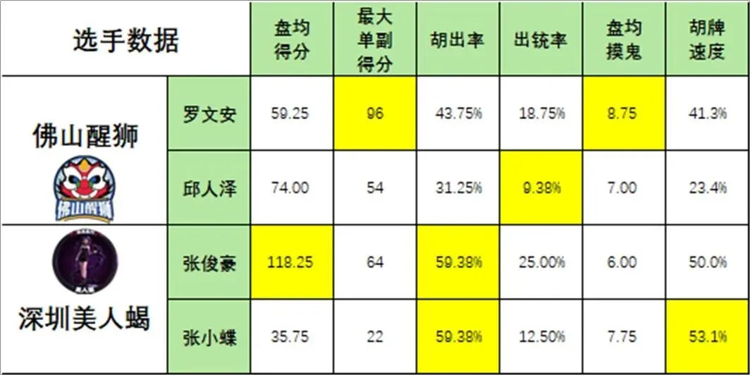 第1盘第1副:罗文安(佛山醒狮)胡张俊豪(深圳美人蝎)点,门清,打1鬼无鬼;张小蝶(深圳美人蝎)自摸,混一色,打2鬼有鬼;邱人泽(佛山醒狮)自摸,混一色小三元,打1鬼无鬼