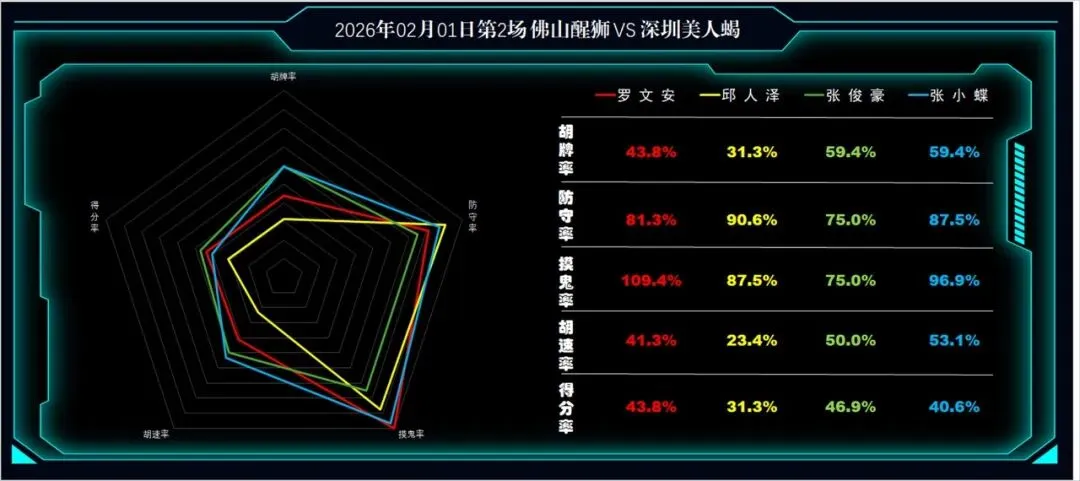 第1盘第5副:邱人泽(佛山醒狮)胡张俊豪(深圳美人蝎)点,七对,有鬼;罗文安(佛山醒狮)自摸,门清,有鬼