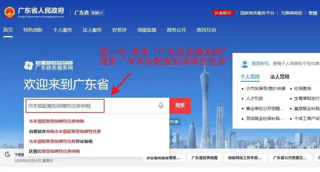 申请家庭可在2026年2月2日上午10时至2月13日下午17时在广东政务服务网(https://www.gdzwfw.gov.cn/)搜索“市本级配售型保障性住房申购”公共服务事项,点击“在线办理”填写申请信息。