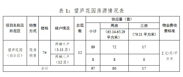 白云区望庐花园则是新开项目,共97套房源,包括80套两房和17套三房,销售基准价为22800元/平方米,一房一价结合房屋楼层、朝向等因素在基准价±20%的范围内调整确定,单套销售价格约18240元/平方米—27360元/平方米。